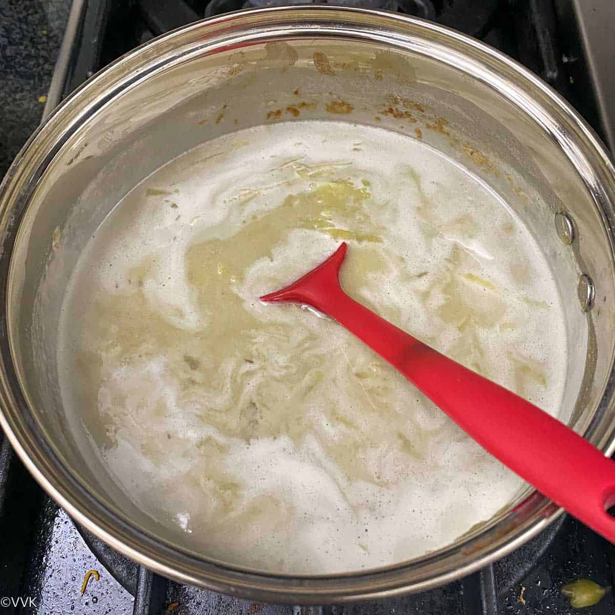 - Now add the coconut milk and mix thoroughly. Simmer the kheer for about 5 minutes over medium-low heat and turn off the heat.