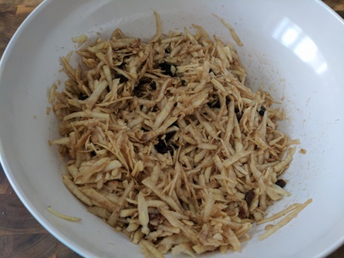 - In a large bowl, combine sweet potatoes, ginger, raisins, cinnamon, sugar, and vanilla.