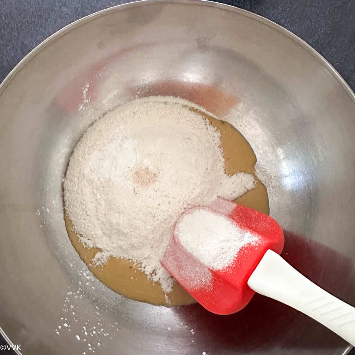 - Now gently mix the other dry ingredients – all-purpose flour, salt, and baking powder.
