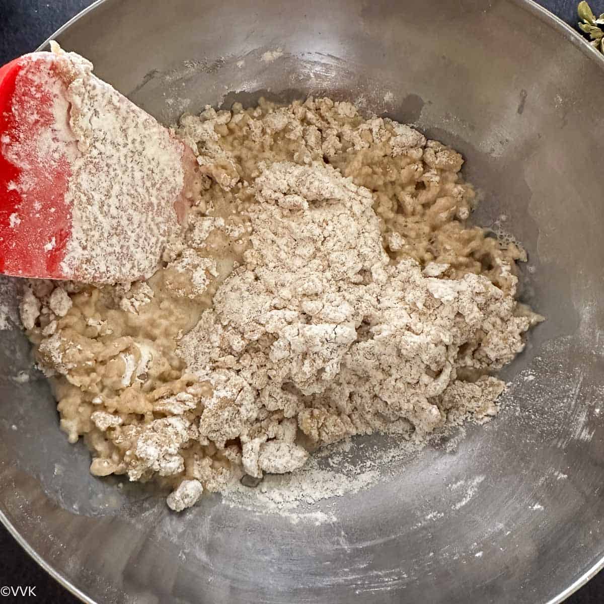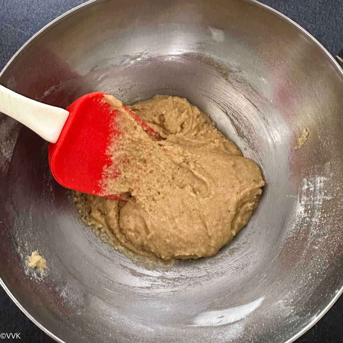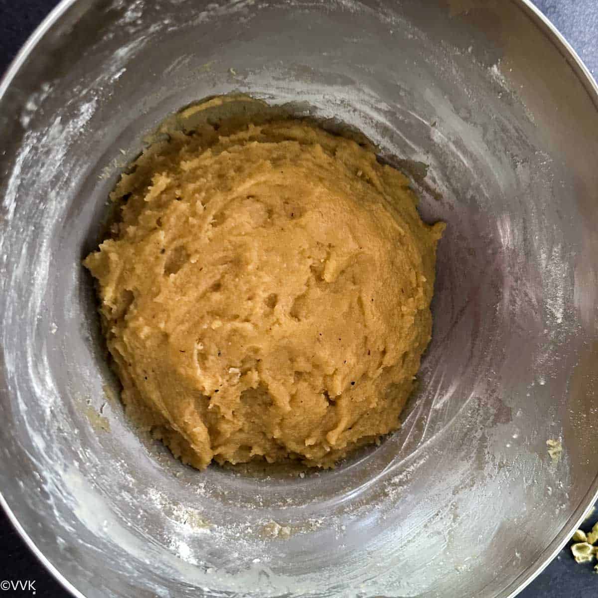 - Add 3 to 4 tbsp of oats milk and form the cookie dough. If required, add one more tbsp of milk. Do not add all the milk at once. Make sure there aren’t any lumps of dry flour. You can use your hand to mix and bring the cookie dough together.