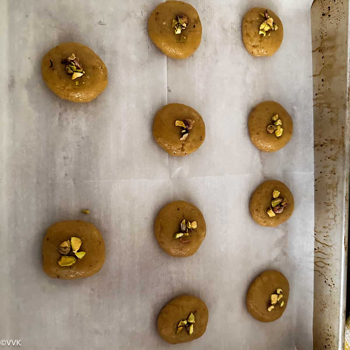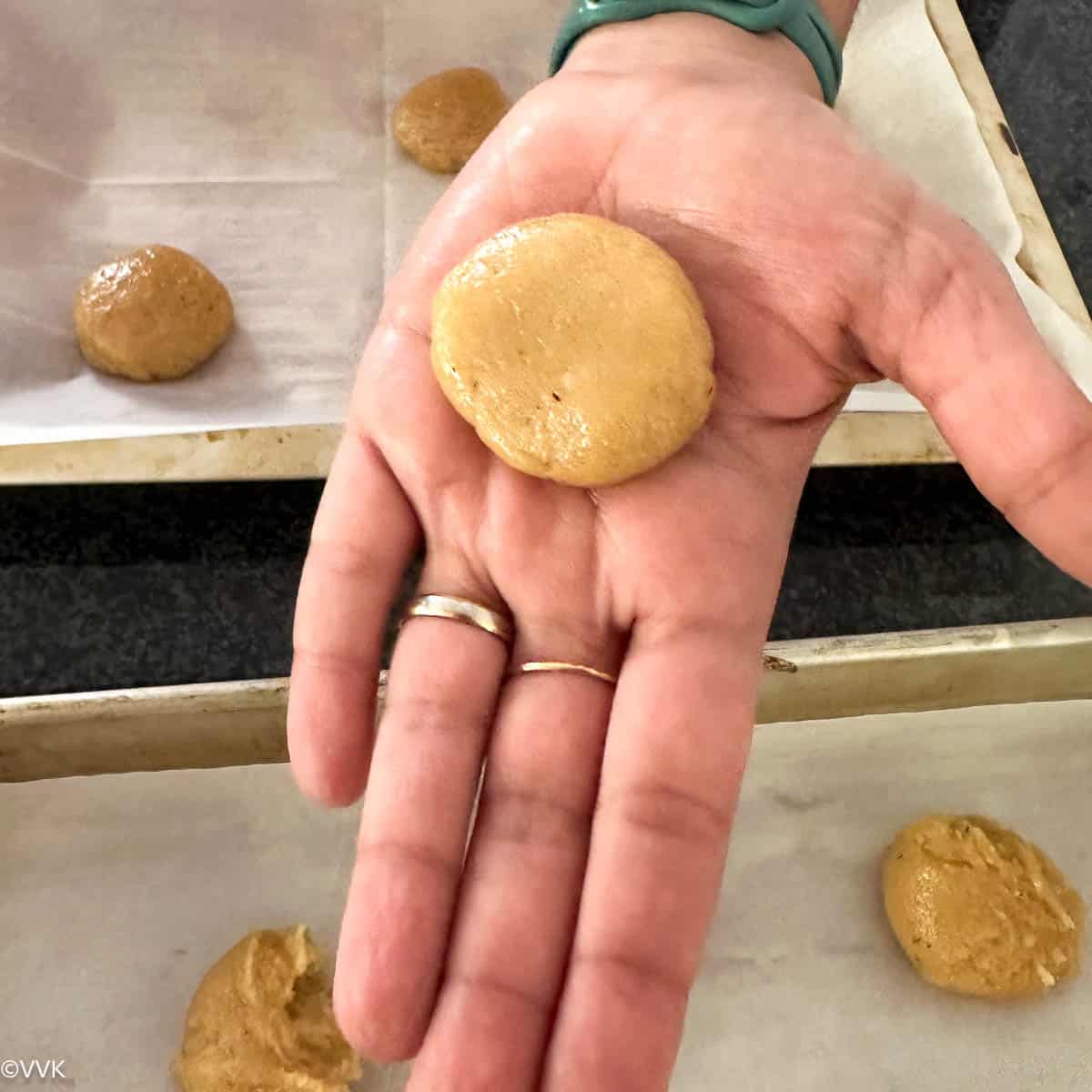 - In a cookie pan, either line an aluminium foil or parchment paper. Scoop 1 to 1.5 tbsp of the cookie dough, gently roll it with your palms, and flatten them. Place these flattened cookies on the baking tray.