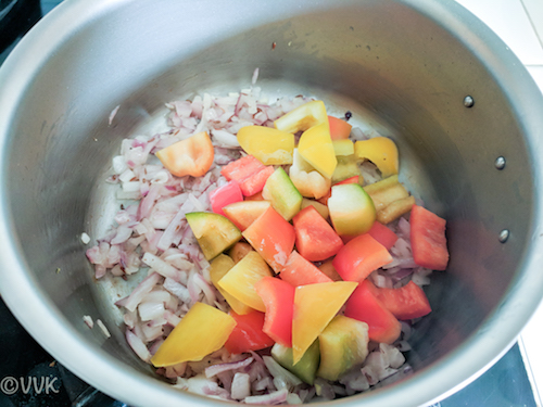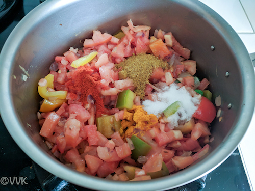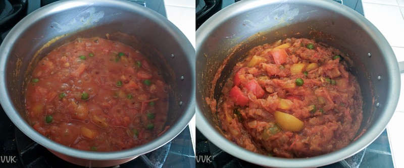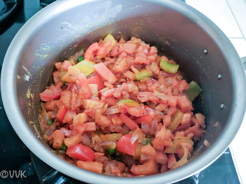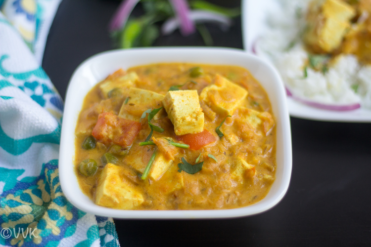 Now coming back to the recipe, all you need to do is prepare the tomato gravy base and add the coconut milk and tofu and viola it’s done. I did include peas and bell peppers for color, crunch, and flavor. But that’s entirely optional. Also, I used curry powder for spicing this up. If you can’t source curry powder, you can replace it with garam masala or with coriander + garam masala combination too. Check notes for the other alternatives.