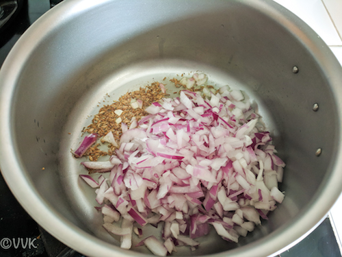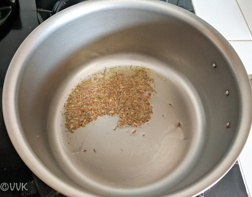 - When the oil is hot, add the cumin seeds and let it crackle.