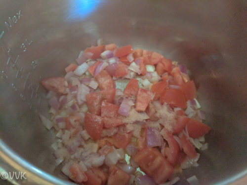- As the onions become translucent add the chopped tomatoes, ginger garlic paste, and salt.