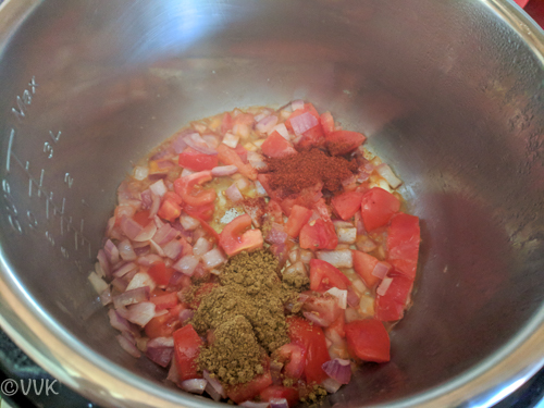 - Saute for 3-4 minutes or until the raw smell of the spices weans away.
