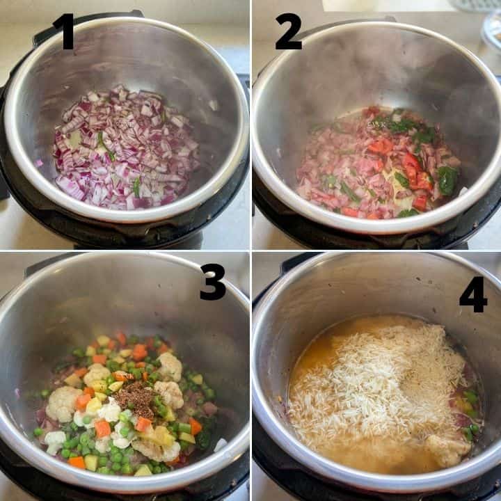 I made this veg pulao in Instant Pot, but you can also make it in a stove-top pressure cooker. You first temper and add onions and saute them in a pressure pan or cooker. Then add the veggies, rice, and salt and pressure cook for just one whistle over medium flame. Then reduce the heat to low and cook for 5 minutes. Then release the pressure naturally. You can also try cooking for two whistles and turn off the heat and release the pressure after 5 minutes.