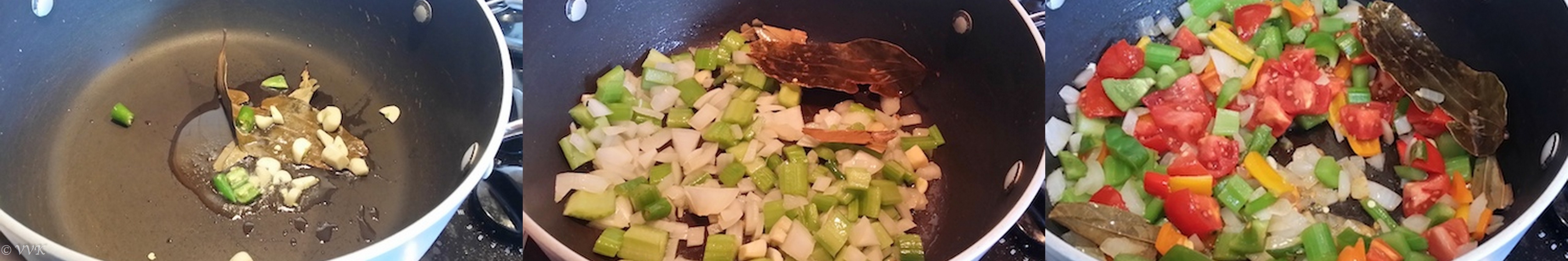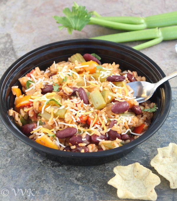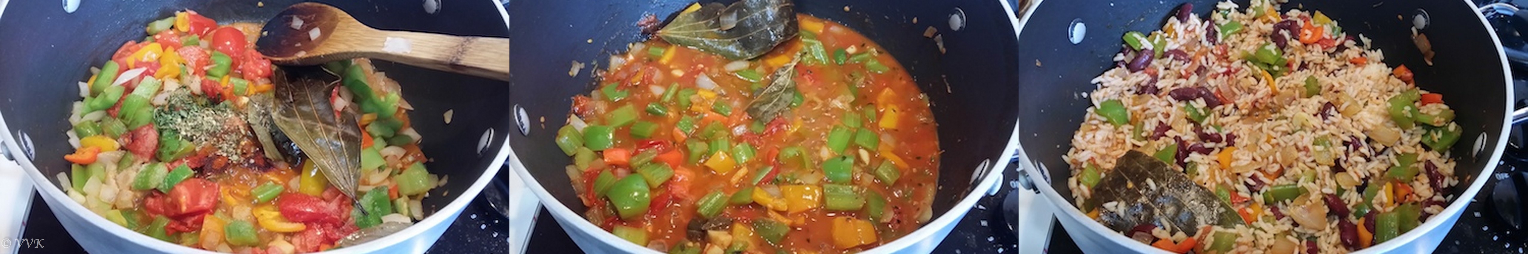 The main ingredients in this recipe are the holy trinity vegetables – Celery, onions and bell peppers and these veggies forms the base of many recipes originated from Louisiana. I used all colored peppers, but green is more than sufficient. To replace the meat protein, I added beans. (Of course, red kidney beans, didn’t I mention, rajma pulao) When I saw celery on the ingredient list, I was a bit reluctant but went ahead and added them. Gosh, celery elevated the flavor of this recipe especially loved the crunch that I got from celery. Celery jelled well in this dish, and this recipe is a great way to get acquired to the celery taste.