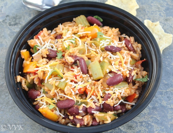 Vegetarian Jambalaya is a vegetarian version of Louisiana special Mexican rice dish prepared with trinity vegetables and beans, served with cheese & chips!