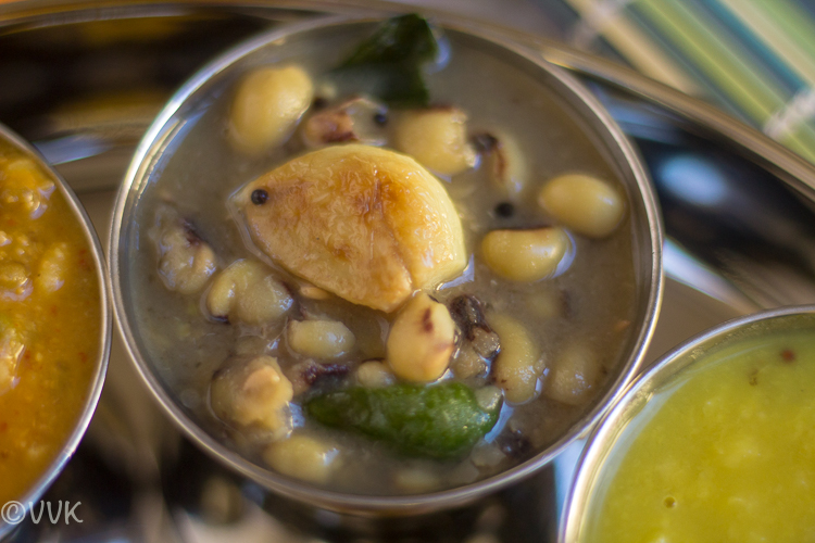 A simple Vegetarian Konkani Thali style curry prepared with black-eyed peas and flavored with garlic tempering. You can find the recipe here.
