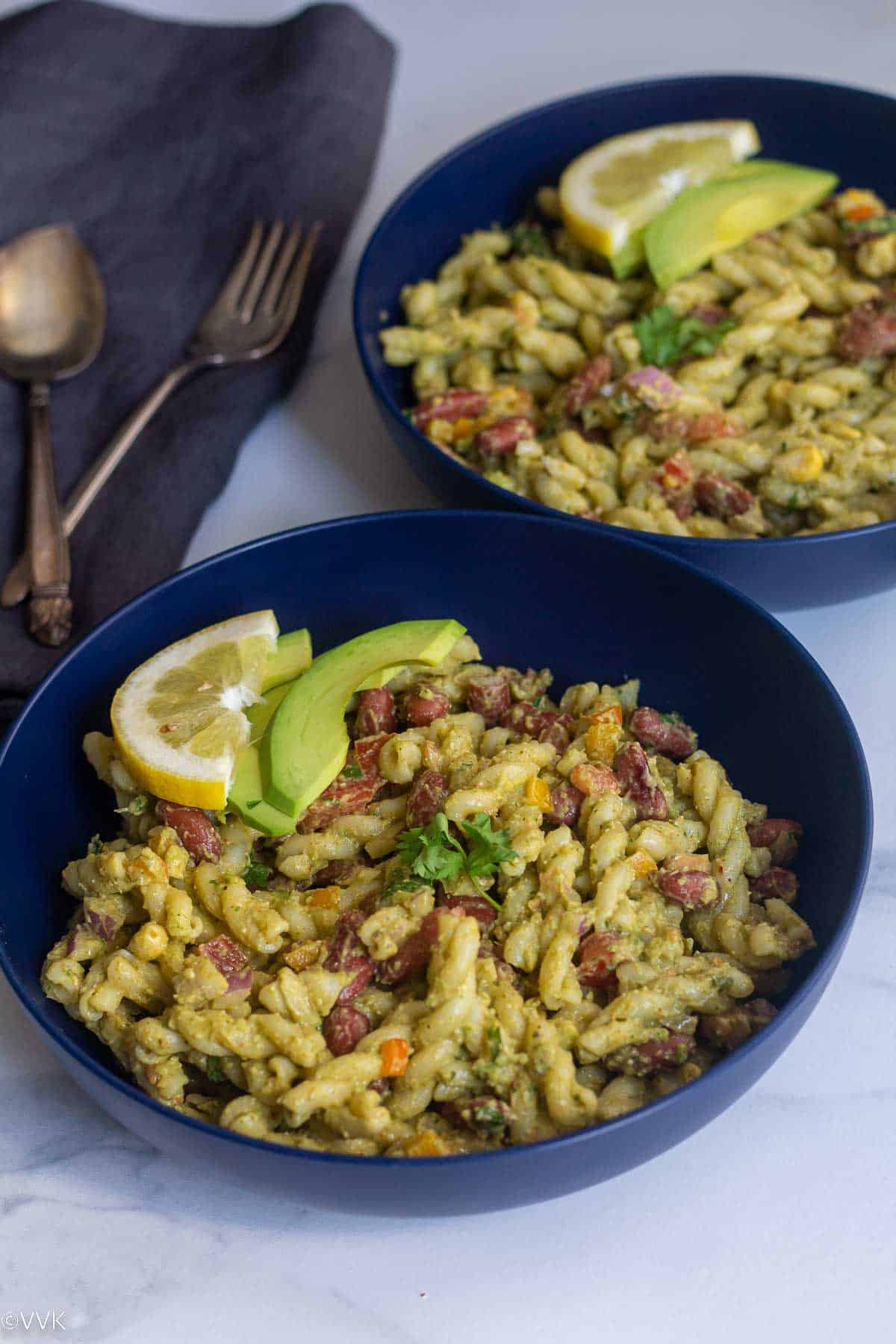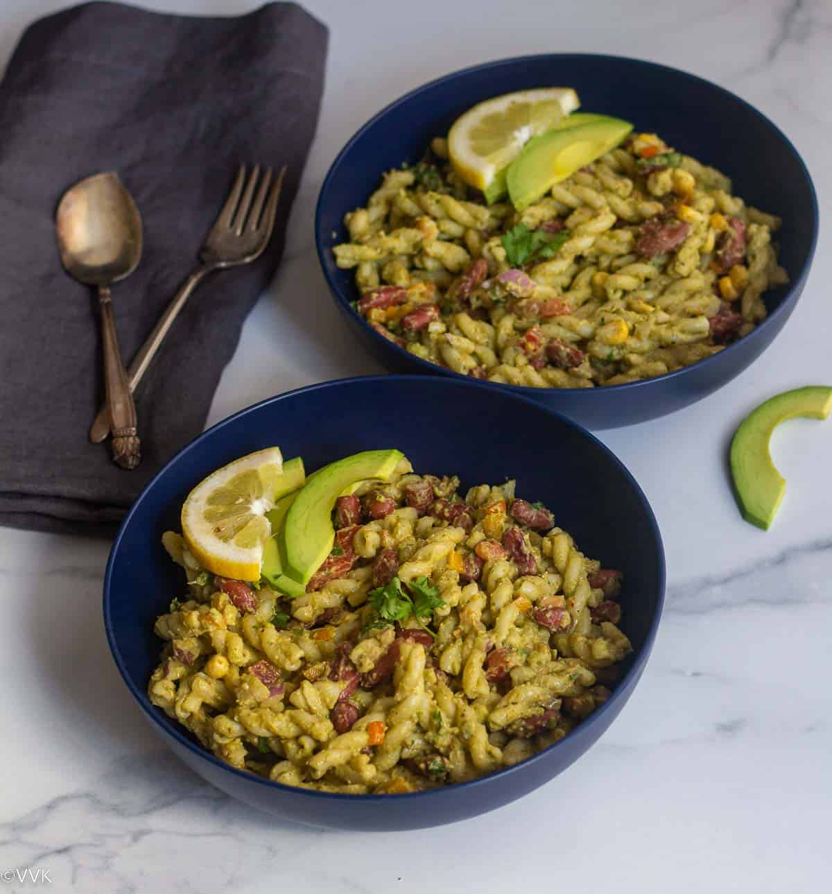 The new recipe in my “easy dinner ideas” theme is a delicious vegetarian taco pasta salad with creamy avocado dressing. Earlier I had shared kanjiyum payarum and falafel salad, do check those recipes too.
