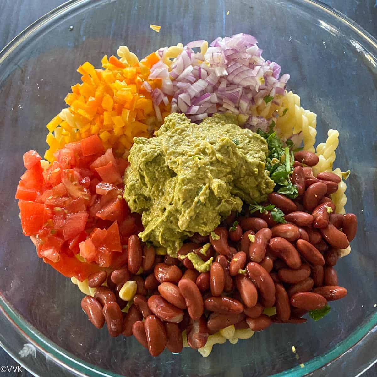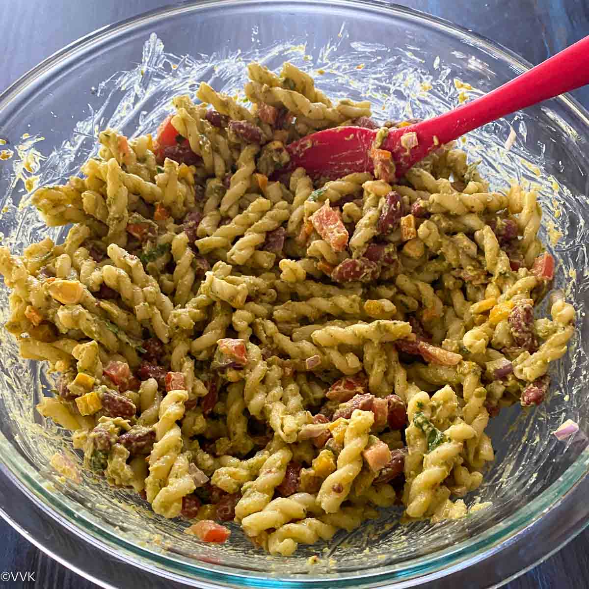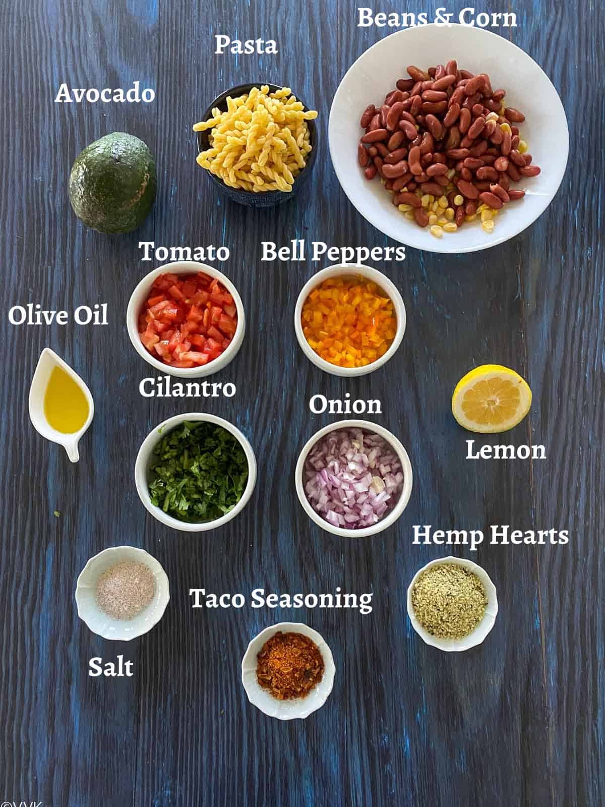 Our favorite seasoning these days is taco seasoning. I am using it in most Mexican-inspired dishes, be it my Tex Mex veggies or vegetarian taco soup, or this pasta; I used the taco seasoning to flavor it. Like every other salad recipe, you can customize this as per your preference.