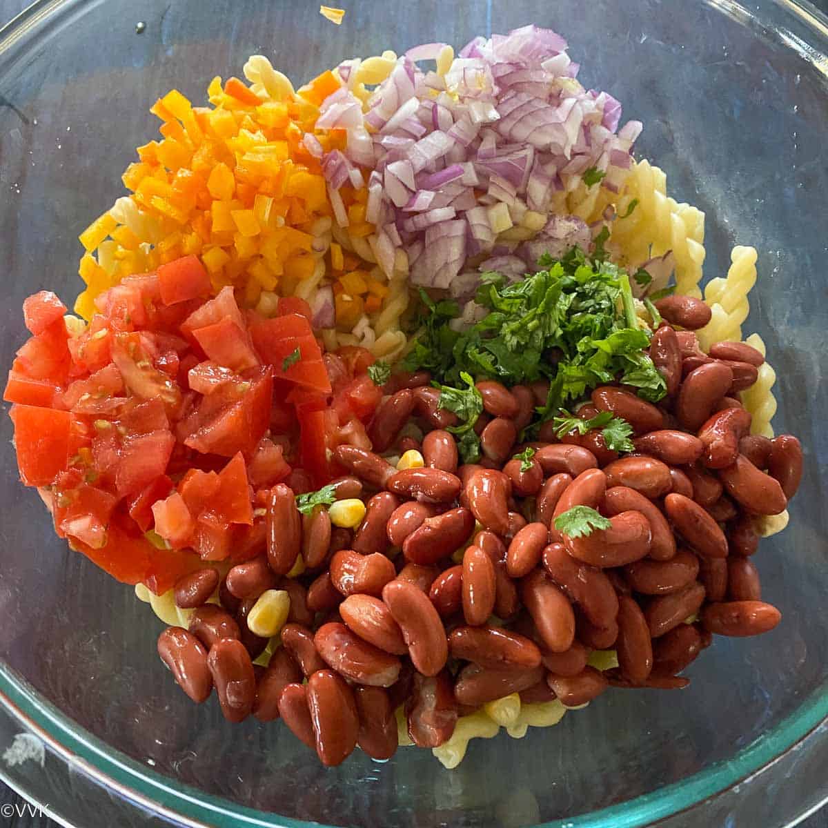 - Add the cooked pasta, chopped onion, bell peppers, tomato, cilantro, kidney beans, corn, olive oil, and remaining salt to a mixing bowl.