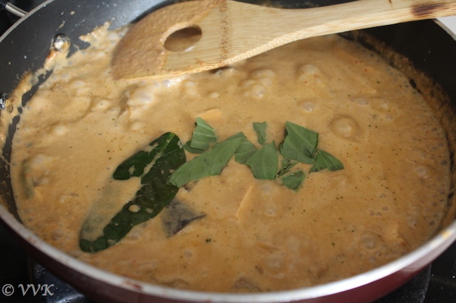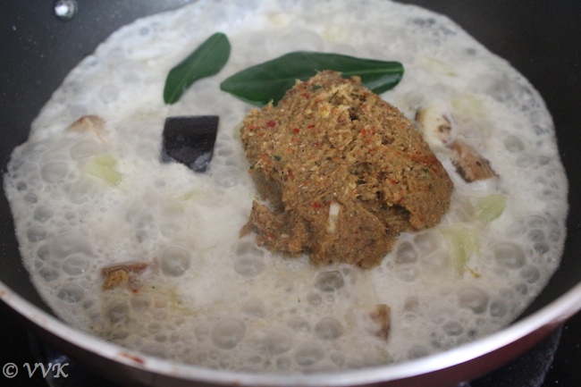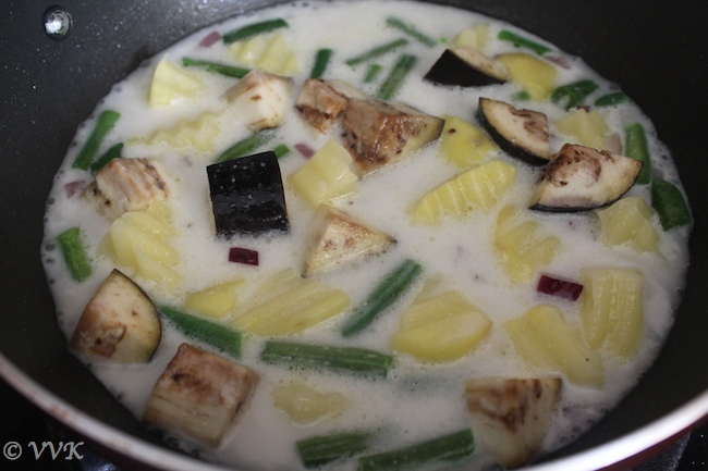 - Now heat the pan/kadai and add oil. Once the oil is hot, add the veggies alone and saute for a minute. Now add the thin coconut milk and salt.