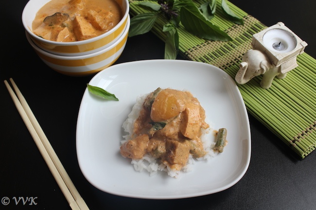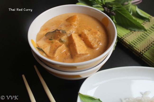 Earlier I posted about the main Thai Ingredients used for the curries, and now it’s time for posting the curry recipes with those ingredients. So here I am today with a red curry recipe. Pretty much all the Thai curry pastes use shrimp paste called Gapi or fish sauce. So obviously, I am skipping them in my recipe and making it vegetarian. I am replacing the protein part (meat) with Tofu. But if you don’t have tofu go with vegetables or with paneer.