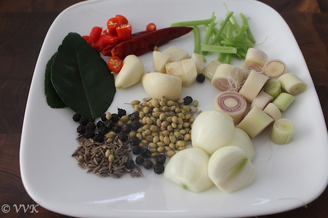 - Grind all the ingredients given under "For Red Curry Paste" coarsely by adding 2 to 3 tbsps water.