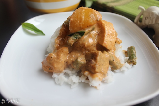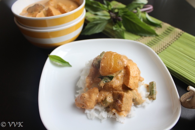 The vegetarian version of the Thai red curry with homemade Thai red curry paste without any shrimp paste or fish sauce but loaded with veggies and Tofu. Check out how to make delicious Thai red curry with detailed step-wise pictures.