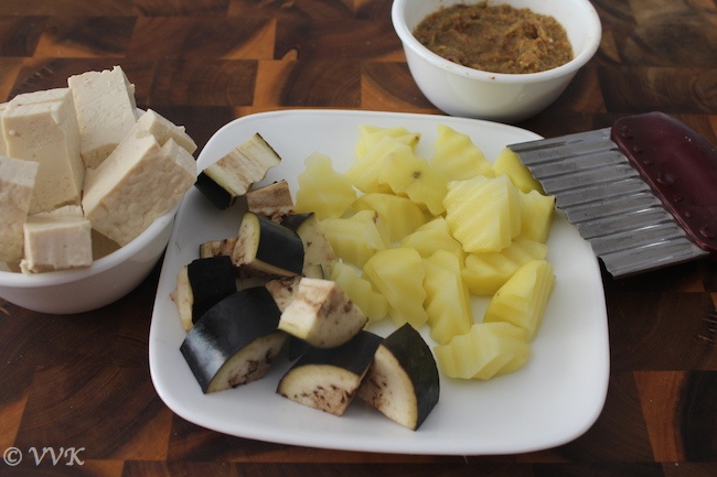 - Chop the tofu into cubes and chop the veggies. I used my curvy knife for these shapes. (Beans is missing here in the picture, I missed it .)