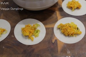- Now place about 1 to 1.5 tsps. of this veggie filling in the center of the wanton wrap and form mothak shape by pinching the edges or close the edges to form semi-circle like our regular kozhukattai.