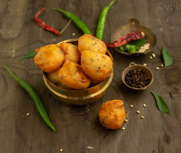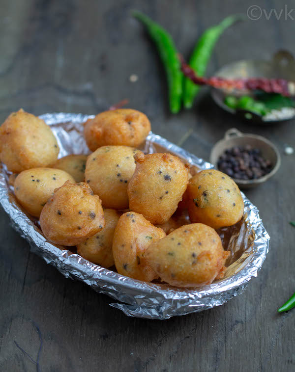 It is more like idli batter pakoras or unukku as we say in our household but the batter proportion and ingredients are slightly different. As we are making this as an offering on the festival day, we usually make the batter with raw rice and not with boiled or parboiled rice. The ratio of raw rice to urad dal is 1:1. As always we don’t add any onion or garlic. The black peppercorns and ginger add a unique flavor, and you won’t miss onions for sure.