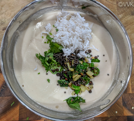 - Also, add the grated coconut and cilantro if using to the batter and mix well. The vellai appam batter is now ready.