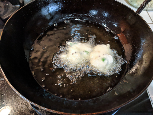 - Use a deep rounded spatula or spoon and scoop out the batter and pour it carefully in the oil.