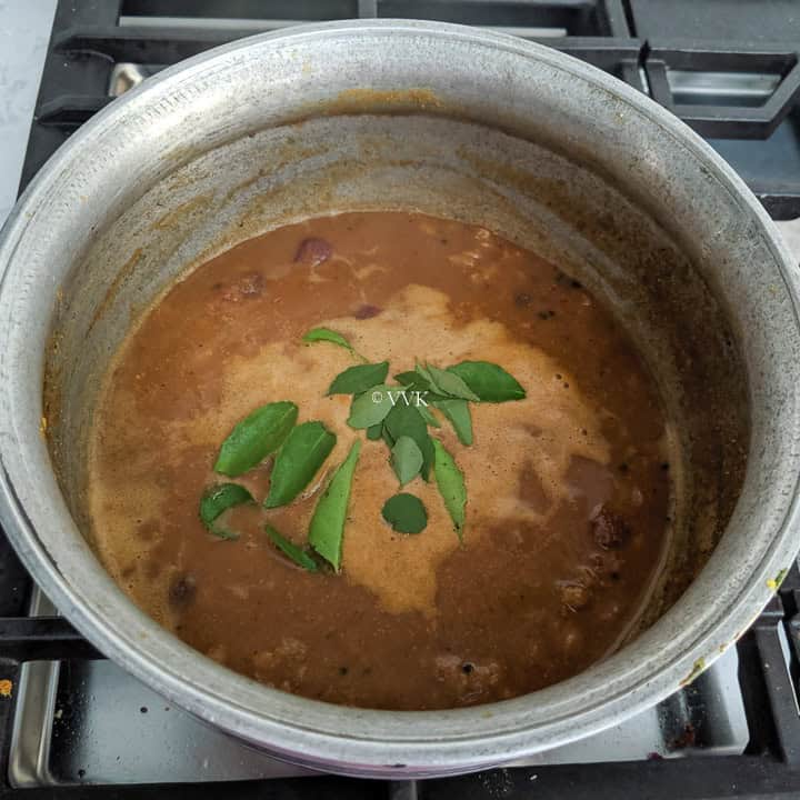 - Reduce the heat to medium-low and bring it to a gentle boil. The sambar will become frothy, and when it starts to boil, turn off the heat. Now add the curry leaves and cover the sambar partially. Let the flavor infuse.