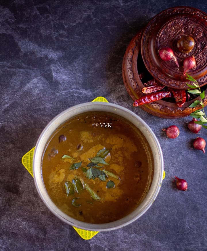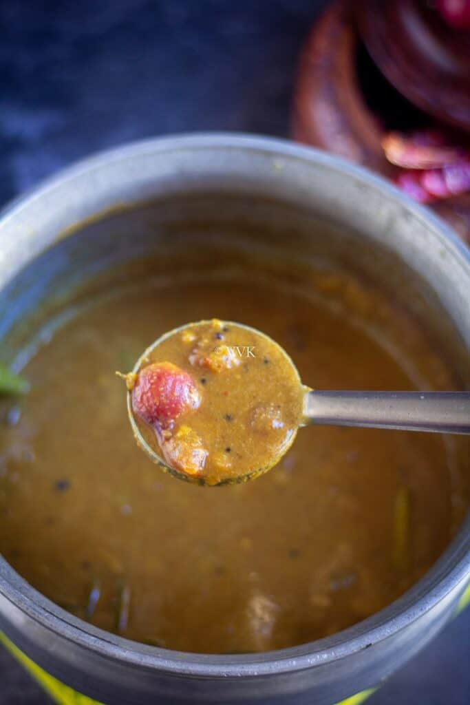 - Check the consistency of the sambar towards the end and adjust the water accordingly. If the kuzhambu is thick, then add ½ more cup of water and simmer for 2 to 3 minutes. If sambar is thin in consistency, mix ½ tsp of rice flour with 2 tbsp of water and add it to the sambar. Bring it to a boil and turn off the heat.