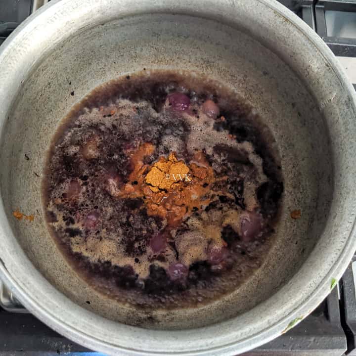 - Add the sambar powder and mix well without any lumps. Let it cook for 3 minutes.