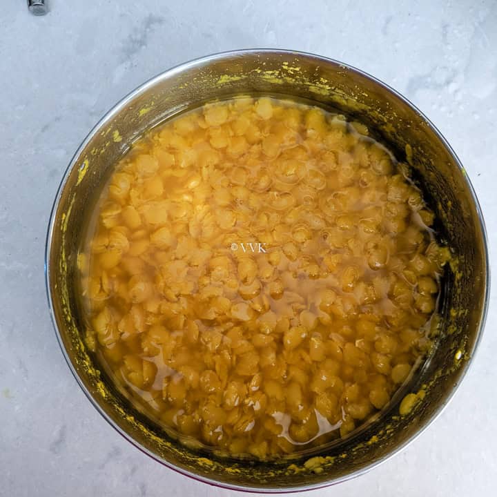 - Rinse the toor dal and drain the water. Pressure cook the toor dal by adding 1 cup of water and ¼ tsp of turmeric powder for 3 to 4 whistles. Let it cool and mash it and set it aside.