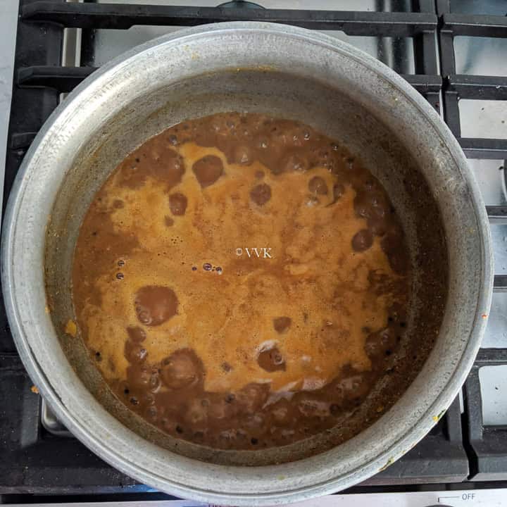 - Reduce the heat to medium-low and bring it to a gentle boil. The sambar will become frothy, and when it starts to boil, turn off the heat.