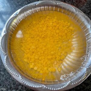 - Pressure cook 2 tbsp of toor dal with 1 cup of water, ½ tsp turmeric powder, and a few drops of oil for 3-4 whistles. If using an Instant Pot, cook the dal using the pot-in-pot method for 20 minutes.