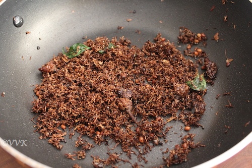 - Heat 2 tablespoons of oil in a pan or kadai. Shallow-fry the sun-dried chilies until they turn a brownish-black color, turning them occasionally to ensure even cooking. Remove them and set aside.