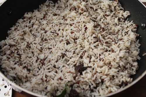 - Reduce the heat to low, then add the cooked rice along with the salt. Gently mix everything. Crush the sun-dried chilies lightly and add them to the rice, mixing again.