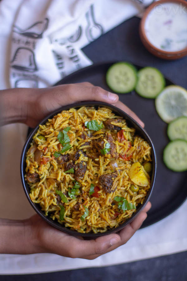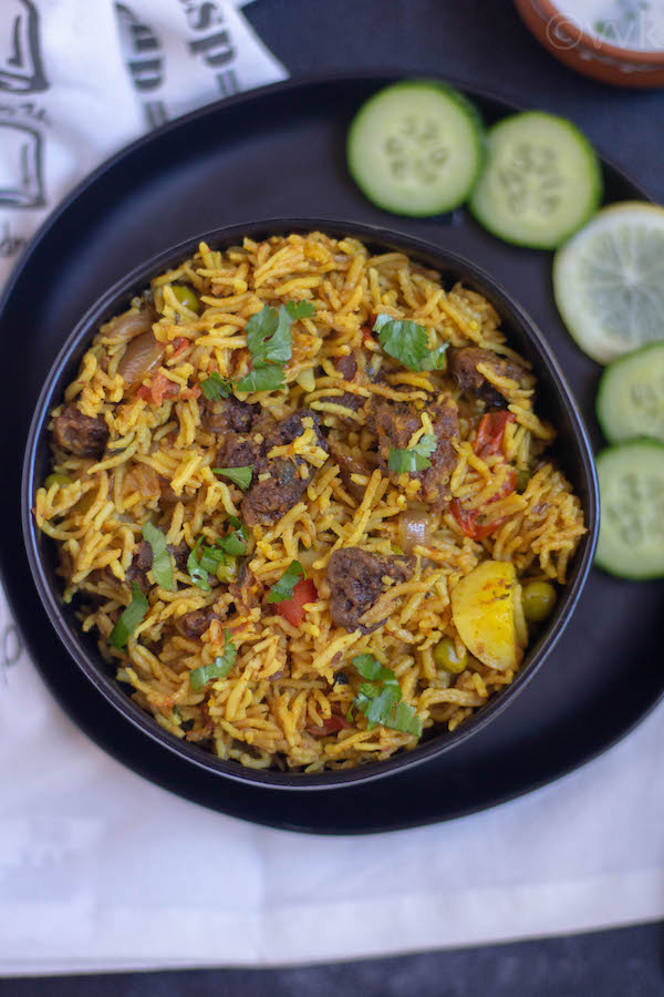I am using the word “spicy” a lot, but believe me, folks; this biryani is not spicy at all. To my surprise, kiddo loved this biryani a lot. And I packed this for his lunch too. You can serve this with plain yogurt, and you don’t need raitas or curries.