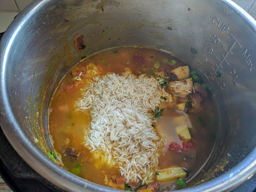 - Add rice and water and gently mix. Make sure to scrape the bottom of the Instant Pot.