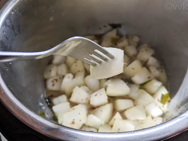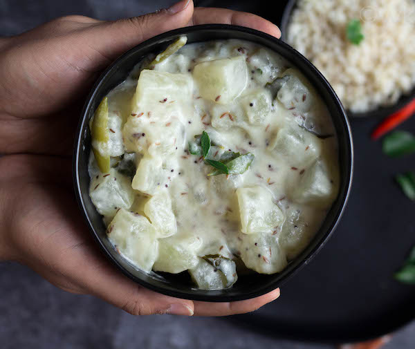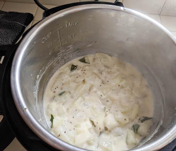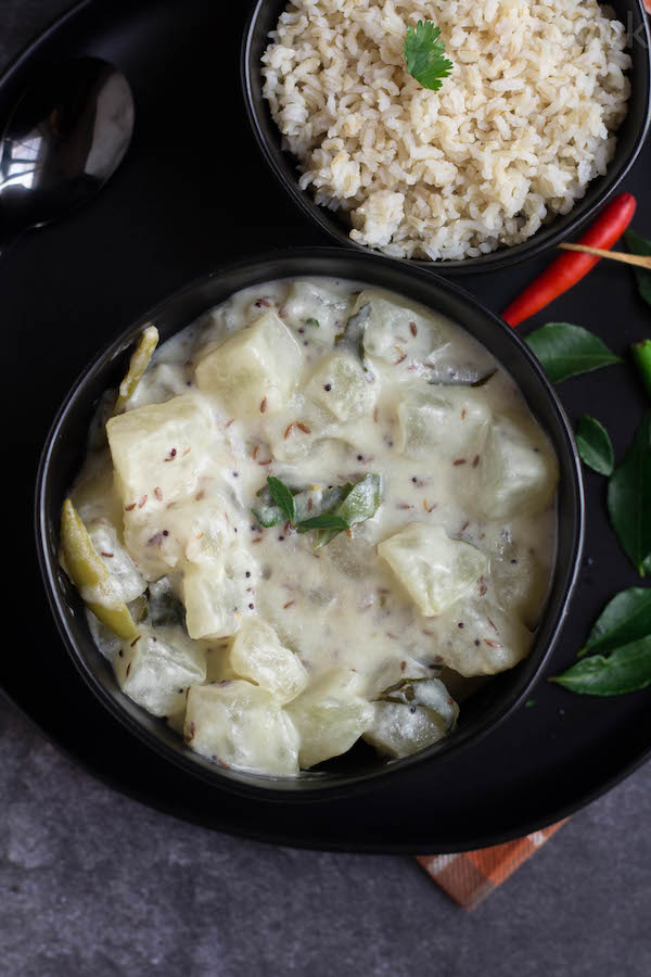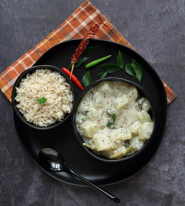- Pressure Cooker Version: If you are making this in the pressure cooker, then cook the white pumpkin for only two whistles. Right after tempering, add ½ cup of water and the vegetables. Pressure cook for two whistles and release the pressure naturally. Then add the coconut milk mixture and simmer.