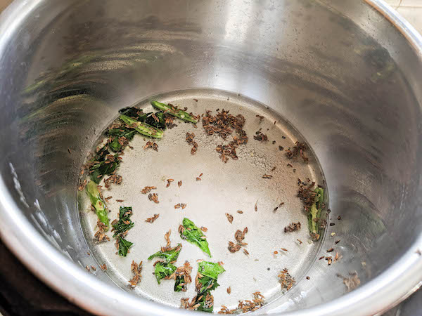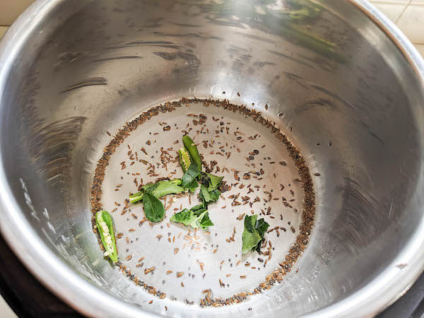 - After 30 seconds, add the mustard seeds, cumin seeds, slit green chilies and curry leaves. Let the mustard seeds sputter.