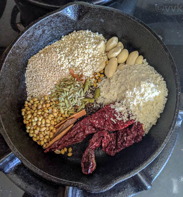 - In a pan, dry roast all the ingredients given under "For the Xacuti Masala" until the sesame seeds pop. (Four to Five minutes) Ensure you dry roast over low heat.