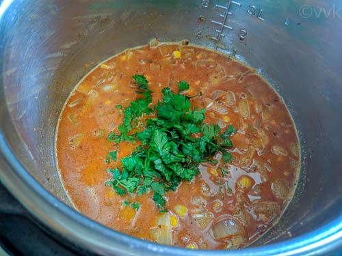 - Scrape the bottom and mix thoroughly. And then add the cilantro on top and mix gently.