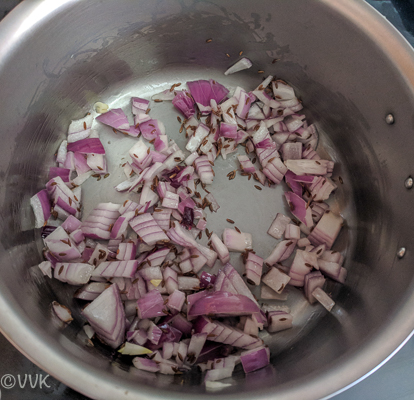 - When the oil is hot, add the cumin seeds and let it splutter.
