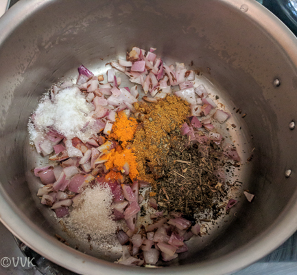 - Now add the salt, sugar, crushed kasoori methi, turmeric powder, and curry powder.