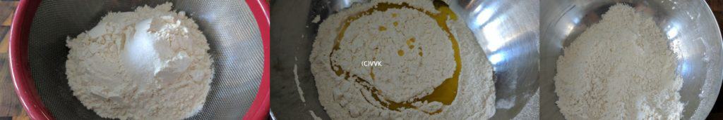 - In a wide bowl add the sifted flour, salt, and olive oil and combine them.