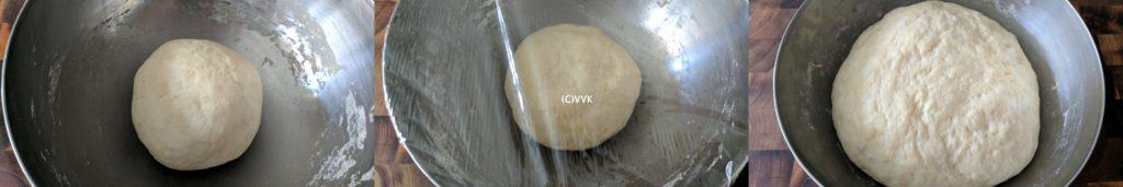 - Transfer this mixture to a wide bowl greased with oil and cover it with a cling wrap and set aside until the dough has doubled in size. It took me about 1.5 hours this time.