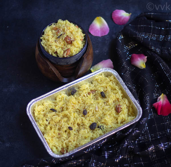 Also, I did not add any food color instead added a pinch of turmeric powder. I know its odd, but I did not want to add any artificial food color as I usually make this as Prashad/offering for God. When I go to the temple or on Thursdays, I try to make, and this Zarda pulao is one among them. I made this for taking it to the temple.