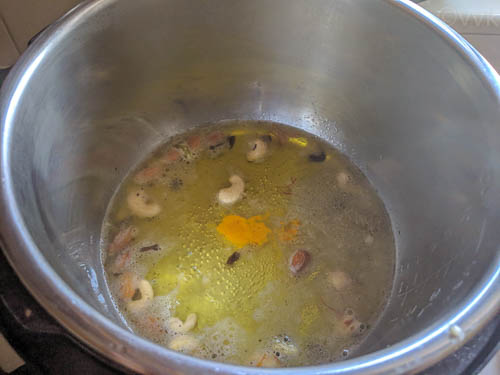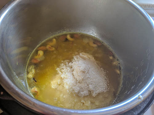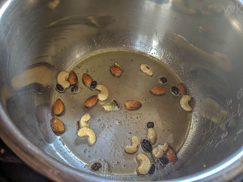 - Set the Instant Pot in saute mode. When the display shows “HOT,” add the ghee and allow it to melt. Now add the almonds, cashews, raisins, cardamom, and cloves — Fry for 40 to 45 seconds.