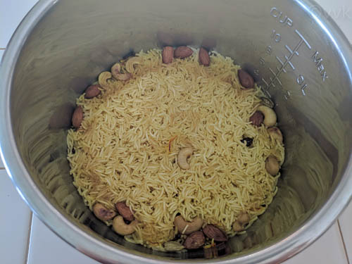 - Add nuts of your choice. You can add crumbled khoya and pomegranate arils after cooking the rice as a garnish.