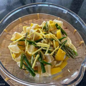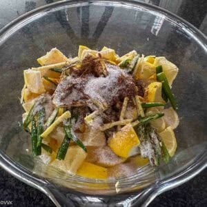 I’ve experimented with Meyer lemons and other varieties, and aside from slight differences in soaking time, the results are quite similar. However, if the lemon skin is too thick, the pickle can turn bitter, so it’s best to avoid those varieties. For this recipe, I used a hybrid variety—not Meyer—where the skin is slightly thick but not excessively so. I wan’t bitter so worked perfectly in this pickle.