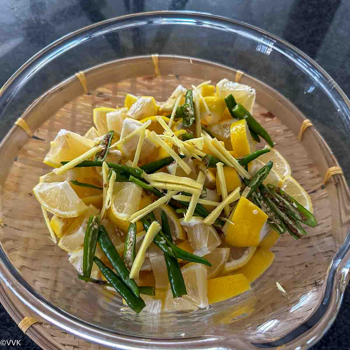 - While it is getting cooled, chop the lemons, chilies, and ginger and add them to a big bowl in which you can mix easily.