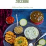 I have zucchini fries, zucchini chutney, zucchini rice, zucchini raita, and zucchini halwa on my platter. I am yet to share the chutney and halwa. But please find the links for the other recipes below.